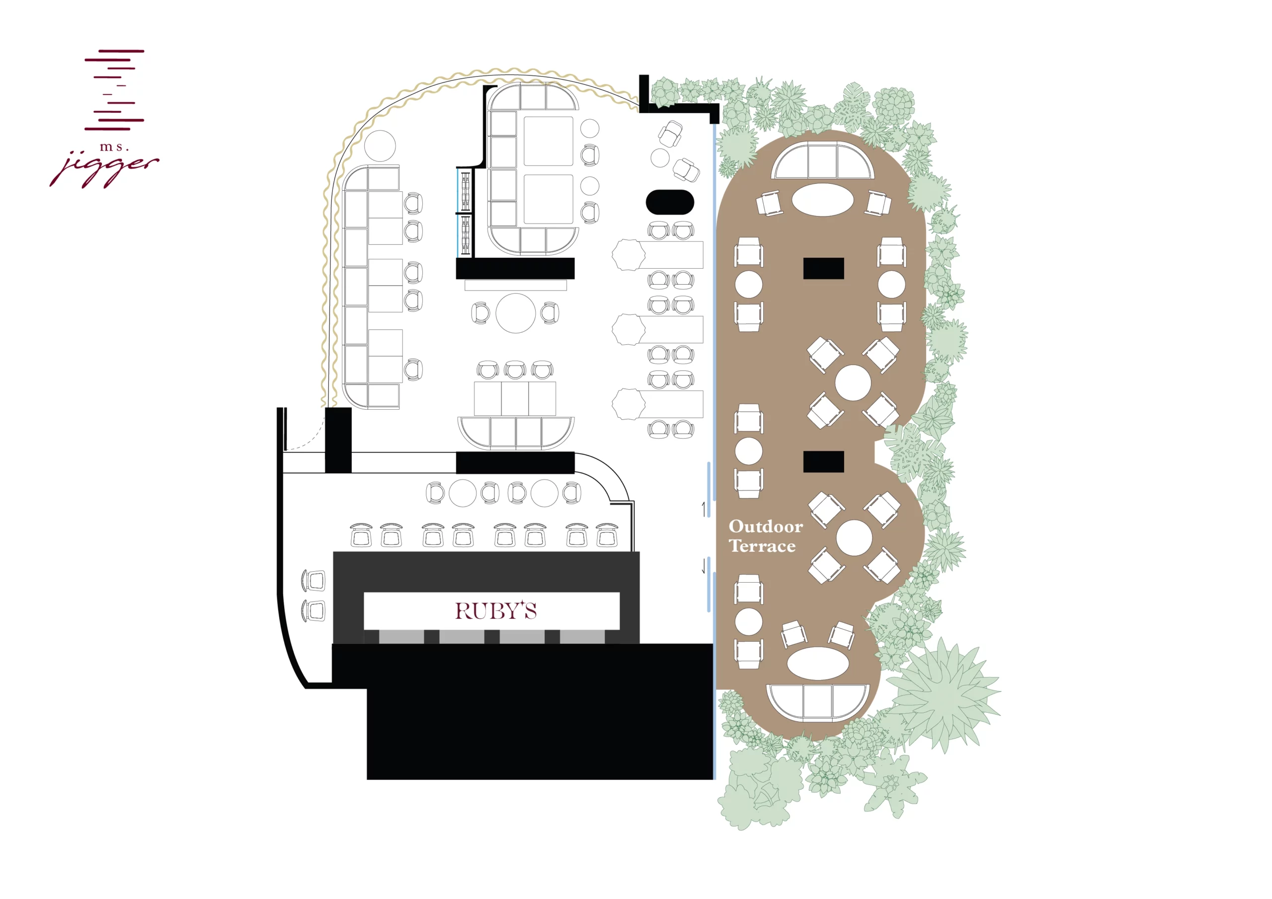 With a total space of 150 sqm, Ms.Jigger accommodates up to 74 guests across its indoor dining room, outdoor terrace and Ruby’s Bar.